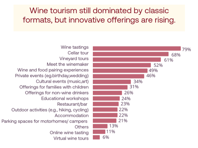 Secondo il Global Wine Tourism Report 2025, uno studio della Hochschule Geisenheim University in collaborazione con UN Tourism, le attività più frequenti sono i tastings, i tour delle cantine e dei vigneti. Gli incontri con i produttori, ecc. A fondo scala le degustazioni on line e i tour virtuali. Altrimenti, che turismo è?